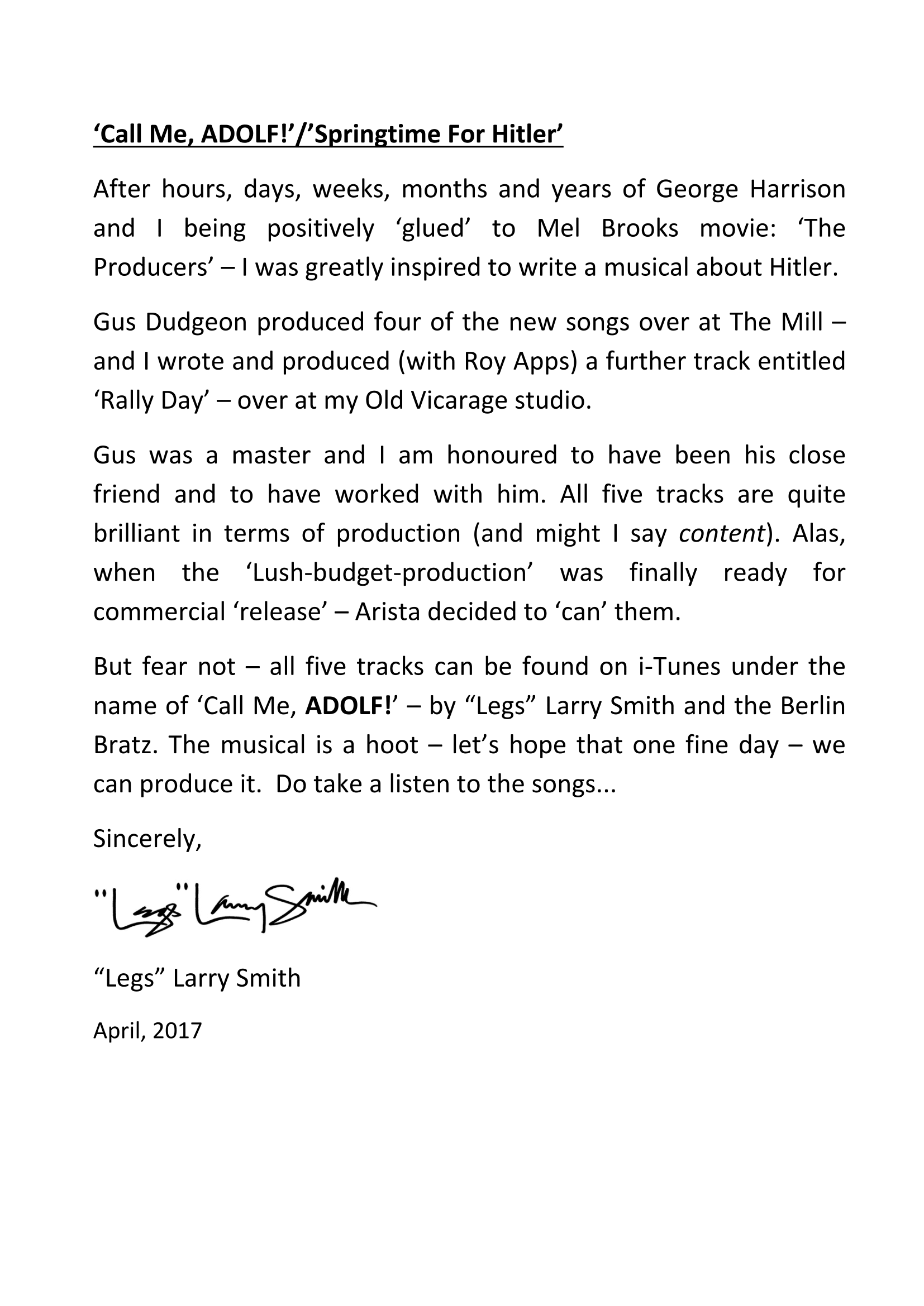 When Legs Larry was approached he confirmed that he too had been thinking of the same project, and so he readily accepted and went on to develop three more tracks based on what could be expected in the stage musical within the film; "Der Fuehrerburger", Eva Braun New Girl", and "Mountain Boy". This musical he named "Call Me ADOLF!" and will hopefully be staged one day.