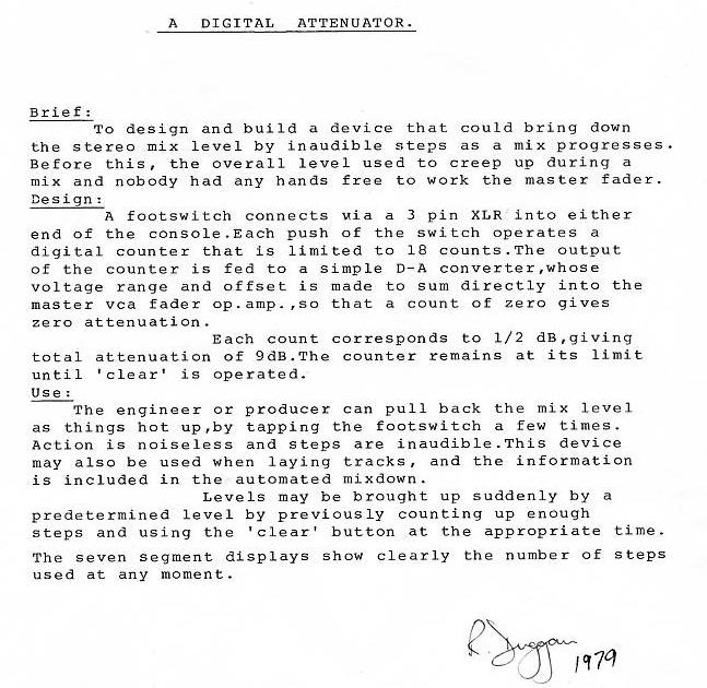 The design sheet for this can be found MCI ConsoleThe recording console was the first MCI JH500 in the UK. It is serial number 002 and is still in use today. Gus & Phil started a long business connection with Jeep Harned of MCI who designed the JH500 console to Gus's requirements. The op-amps run off +/- 37volts which gave the desk enormous headroom, and the design is very simple but extremely flexible in its use, giving an unusually short and clean signal path. The result is a sound quality borne in the golden age of analogue audio design by a music and recording enthusiast, that many would argue has never been equalled since. Equalisers used real inductors, mic amps have real transformers. It was an "inline desk" meaning that monitor and recording sections shared the same channel strip. Traditionally desks had been built with the monitor section and recording section in separate areas of the desk, and as channels and groups increased in number, desks were becoming too large. This new development (attributed to Dave Harrison of MCI who later went on to start his own company, Harrison Consoles in Nashville) made the console deeper as each channel strip now had more electronics, but not as wide, enabling the engineer and producer to remain more central in the stereo sweet spot. Fader AutomationThere was VCA automation in the console, fitted later after delivery, but early desk automation was unreliable as it had lots of discrete 74 series TTL logic chips, which consumed power, got hot and went bad on a regular basis. The DC voltage signals from each channel and group fader along with mute button status were encoded into an audio bandwidth data stream which was then recorded onto one track of the multitrack recorder. This track was subsequently played back and the bitstream was then decoded into voltages to drive the VCAs to their previous levels (hopefully!). The next mix pass was done using the played back bitstream modified with any new fader movements and this was then encoded and recorded onto a second track of the multitrack recorder. The next mix pass was a repeat of this but playing back the second track and over-writing the first track. And so on until the mix was finished. Problems included slow drifting of fader movements in time, levels occasionally becoming wrong, and odd muting. There was no motorised fader movement, so when things went wrong it may not be noticed if subtle, until later on in the mix, all depending on the level of tiredness, fatigue or drug use of the engineer/producer. Many other automation systems existed at the time, all of which worked in a similar unpredictable way. Gus tried it once and then abandoned it, preferring several hands on the faders and human interaction during mixing sessions. CustomisationThe console was built into a custom made wooden "L" shaped desk, with veneered side legs and a desk return to the right which housed the Thorens turntable with SME arm and Shure V15 cartridge under a flush lid, and the outboard equipment underneath (there wasn't the rack full of toys, Gus reckoned the MCI desk had all the effects he needed). Above the top was a meter panel with auxiliary send VU meters, EMT reverb remotes and cue lights for the phone. Later the I fitted an ultra-low capacitance guitar cable link into this panel for control room guitarists with an amplifier in the studio. The checkout engineer for this particular console at MCI was Larry Lamoray, who kindly sent me an email detailing the pre-delivery history of this console, which I kept for inclusion on this page but unfortunately has now been lost due to several Outlook/Thunderbird updates on the computer. Larry if you read this, please re-send the details! Custom gadgetsA digital attenuatorGus found a regular issue when mixing, in that he would push levels up and up during the mix but never had a hand free to bring the master fader down to keep the overall level from going too high. The result was often finished mixes where the poor VU meter needles suffered a severe battering at the end of the track. The solution we came up with was a custom designed digital fader (in 1979!) designed by myself which Gus loved. It consisted of a small foot switch connected to the left leg of the console underneath the faders, which when pressed each time brought the main VCA fader down by half a db, inaudible in operation but with 16 steps which gave a final reduction of 8dB. There was a two digit LED display in the console showing how many steps had occurred, and this could be reset by a small button underneath the display and the gain reverted back to zero.