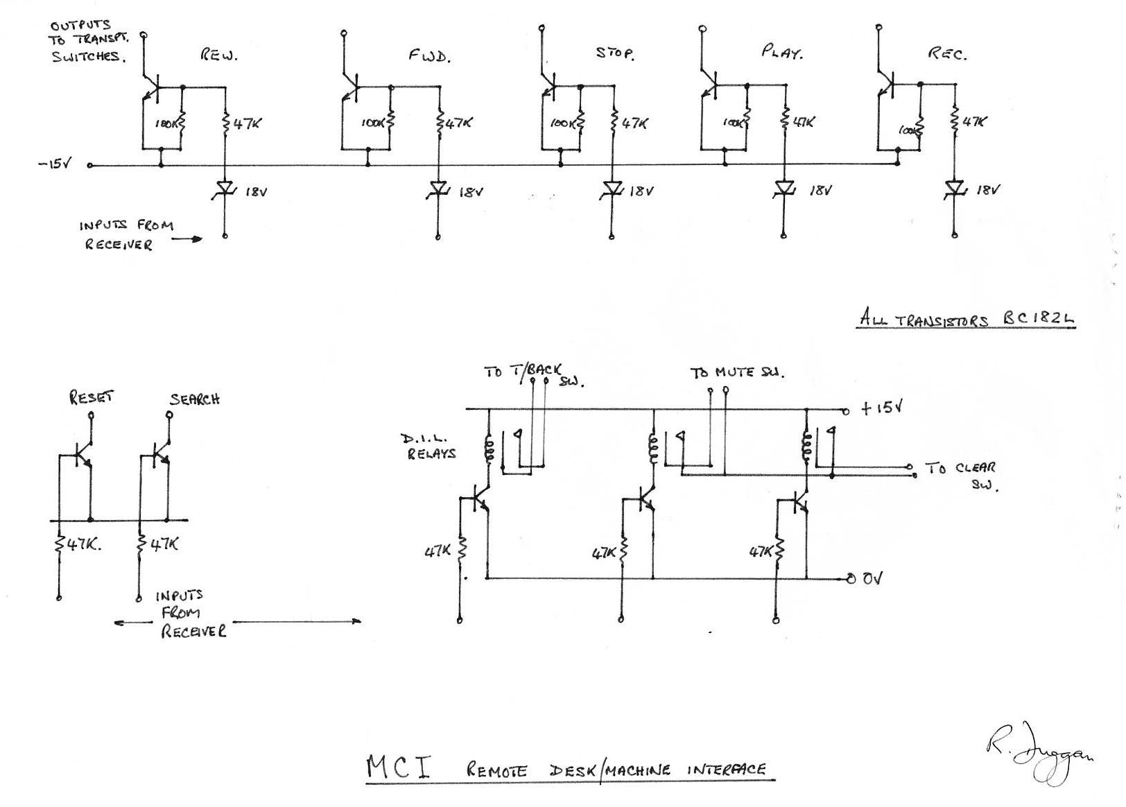 The founder of MCI was Jeep Harned, and I was thrilled to receive the following email from Jeep Harned's daughter Debbie a few years ago: Hi Rod: An American company, MCI, based in Fort Lauderdale, Florida, was chosen by Gus to supply all the tape machines and the large mixing console for The Mill. One reason for this was the story of when Gus was working at The Chateau in France. He walked through the studio into the control room as the band was playing and couldn't get over how close the sound in the control room matched the live sound in the studio. The desk, an MCI JH400 was the best he'd heard and he was then hooked on MCI. The order for The Mill was the biggest MCI package sold outside of the USA at the time. All the equipment was customised with new paint colours and all housed in exotic veneered wooden cabinets. MCI tape machinesThe tape machines in the Mill control room were lined up neatly along the back wall and were all visible in a sort of head up display, reflected in the angled glass window when looking into the studio. They were all MCI machines and contrary to popular gossip at the time, worked not only well but showed very little drift over time after being set up, due no doubt to the initial alignments being correct and subsequent wear patterns being symmetrical and even. The multitrack was carefully aligned and checked each day during sessions, and so long as nobody fiddled with it (the technical engineer's curse), drifted typically by less than half a db on a few tracks over a month. The 24 track machine was a JH16, and had the "Flux-Track" option fitted which was a stepped attenuator on each track in the electronics drawers which raised/lowered the input/output levels by half db steps, so that the machine alignments need not be altered for different flux levels of tapes. There was a spate of deck-warping on MCI machines in the late 70s due to the laminations of aluminium being poorly glued together, however the Mill machines nevert suffered from this. Despite having been well used in its life, the head wear pattern was exceptionally even on both heads, and high frequency tones played back solidly across all tracks. ![]() The multitrack noise reduction was handled by three Dolby rack units mounted at head height at the rear of the room, and gave simultaneous encode/decode functions. They were neatly wired and could be easily hinged down for inspection or to retrieve the odd recreational drug stash. Next to the multitrack were two four track machines and then three two track machines, one of which had a decimal counter and the other two which counted in minutes and seconds. Lots of wrong entries for tape timings ensued, however this was not a problem as very few people noticed. All five of the two and four track tape machines were housed in custom made brass and ash cabinets with simultaneous Dolby encoding & decoding performed by the full complement of A316 units fitted in the space underneath each deck. There was one minor problem caused by people leaning against the tape machines and accidentally altering the switch positions. This was cured by fitting custom made smoked Perspex covers which clipped on to the electronics drawer handles. The two track machines could be converted to half inch operation for mastering at 30ips. Under the ownership of Jimmy Page, there was often the need for different machines, and others were wheeled in when they were needed, including Jimmy's 3M two inch 24 track and Bill Wyman's 8 Track used for copying the backing tracks of "Je Suis". There were wired remotes for all tape machines at each end of the recording console, as well as the traditional MCI Autolocator for the multitrack machine. Gus wanted to be able to control the multitrack whilst leaning back in his chair, and I designed and built a small battery powered infrared remote controller box which not only worked the multitrack and autolocator but also the talkback functions as well.